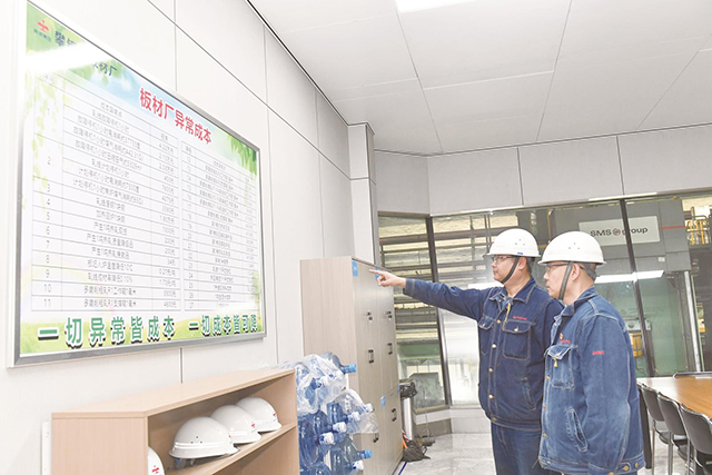 1月13日,攀鋼釩板材廠熱區生產單元職工王俊與楊曉明(左)正在討論生產異常成本。今年以來,該廠將生產指標價值化,實現異常成本清單上墻,全面開展成本班班算、人人算、天天算的算賬生產模式,追求極致成本管控,力保生產經營目標順利完成。